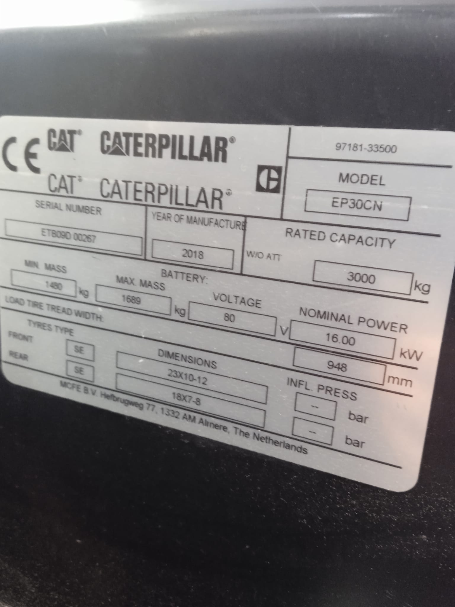 La CAT- EP30CN es una carretilla elevadora eléctrica de cuatro ruedas, ideal para operaciones en almacenes y espacios reducidos. Con una capacidad de carga de 3.000 kg y un mástil trÍplex  que alcanza una altura de elevación de 4700mm, ofrece un rendimiento eficiente para tareas de manipulación de materiales.