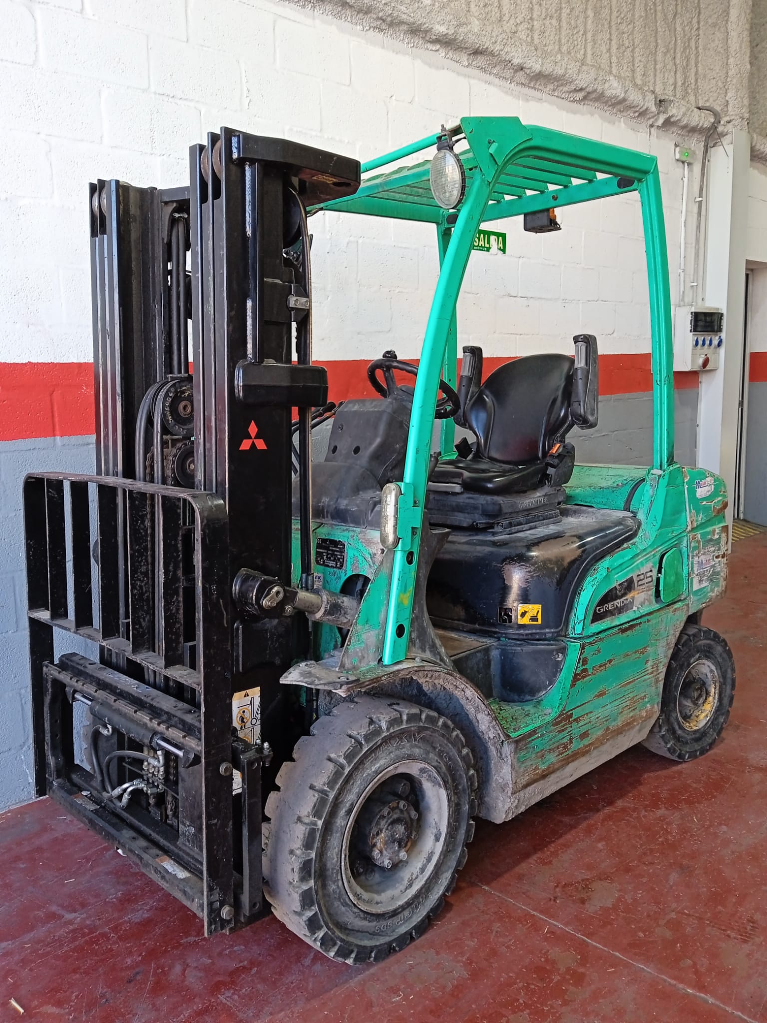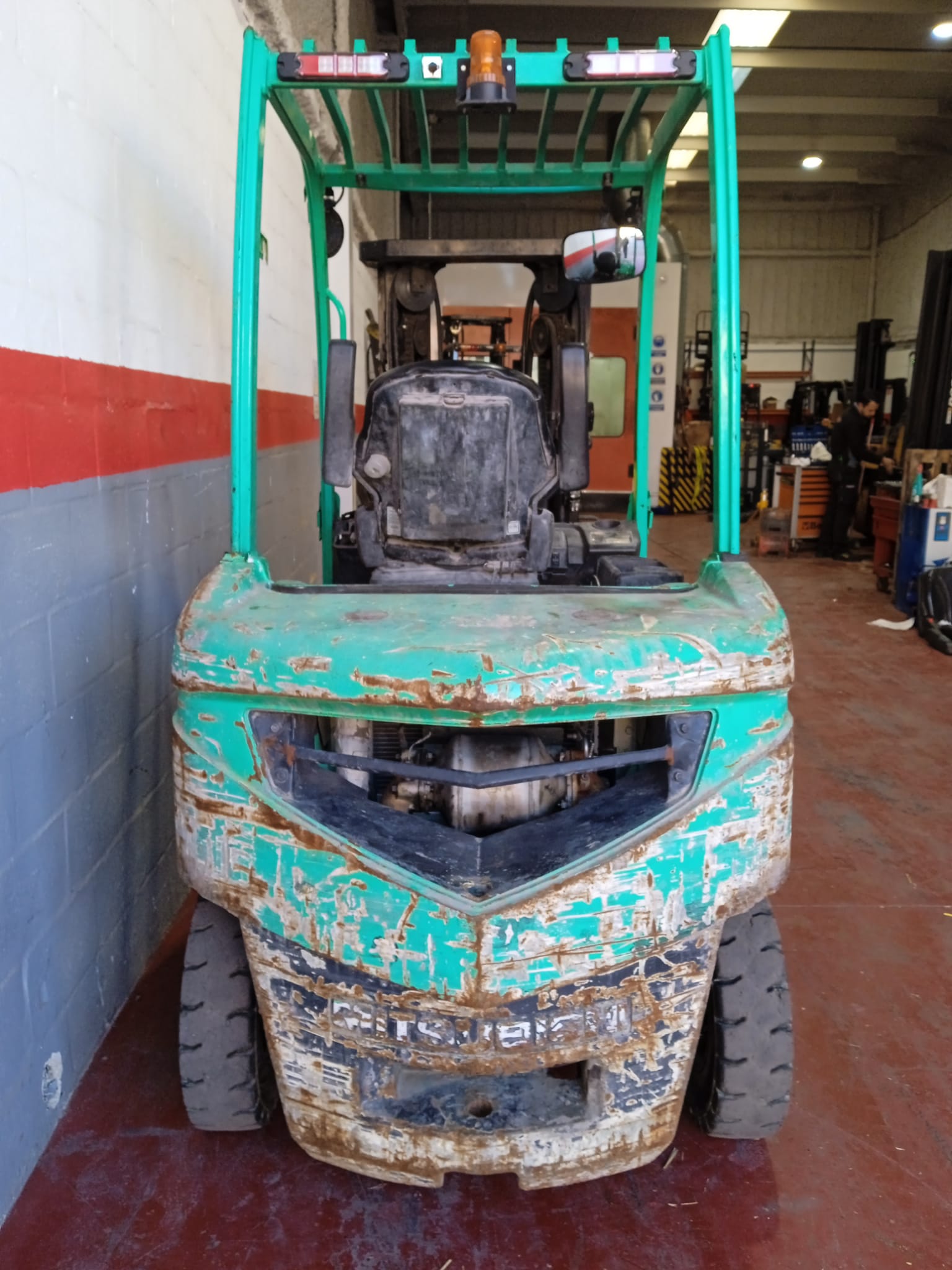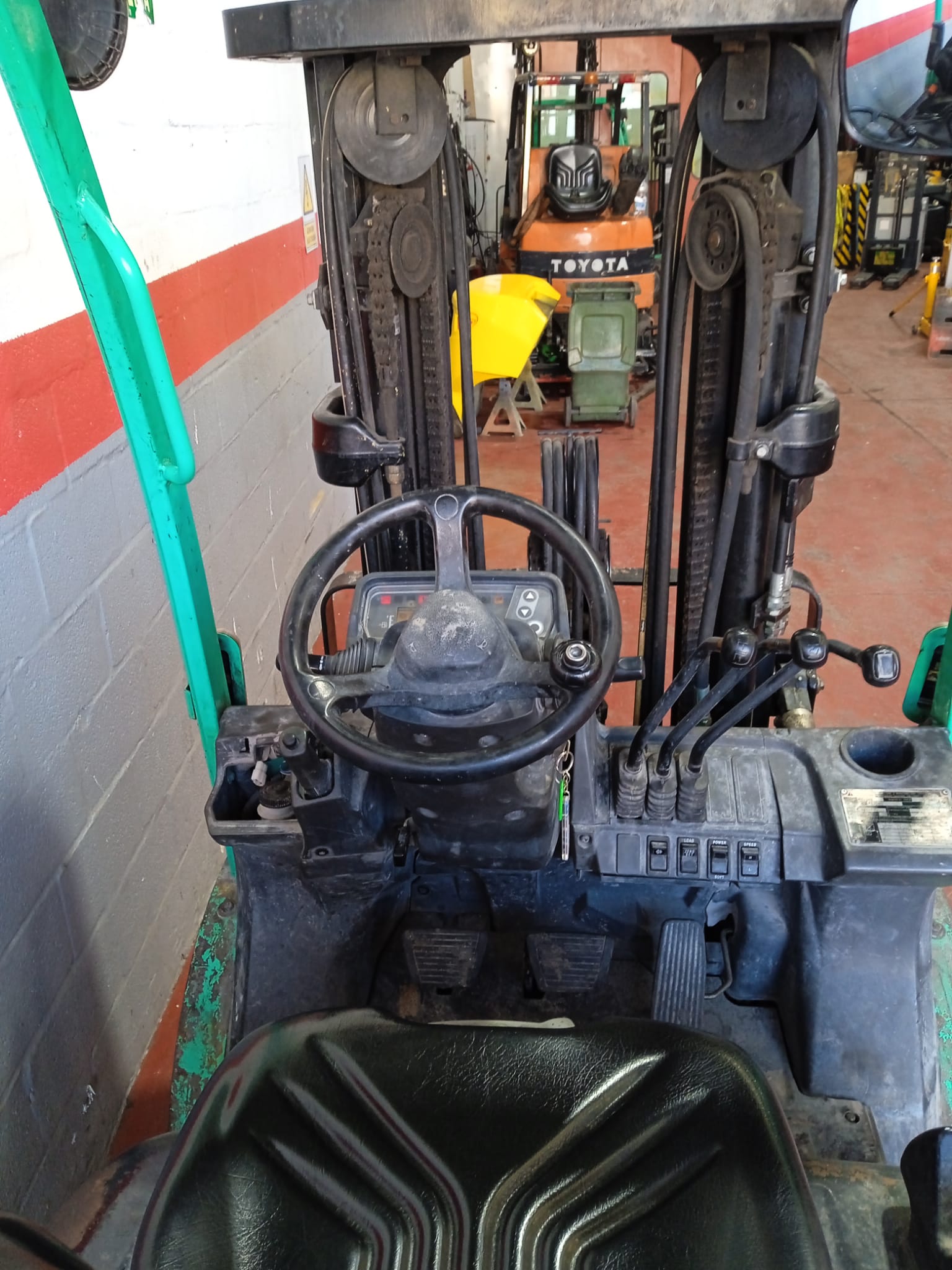 La Mitsubishi FD25NT es una carretilla elevadora diésel de cuatro ruedas, ideal para operaciones en almacenes y espacios reducidos. Con una capacidad de carga de 2.500 kg y un mástil tríplex que alcanza una altura de elevación de 4300mm, ofrece un rendimiento eficiente para tareas de manipulación de materiales.