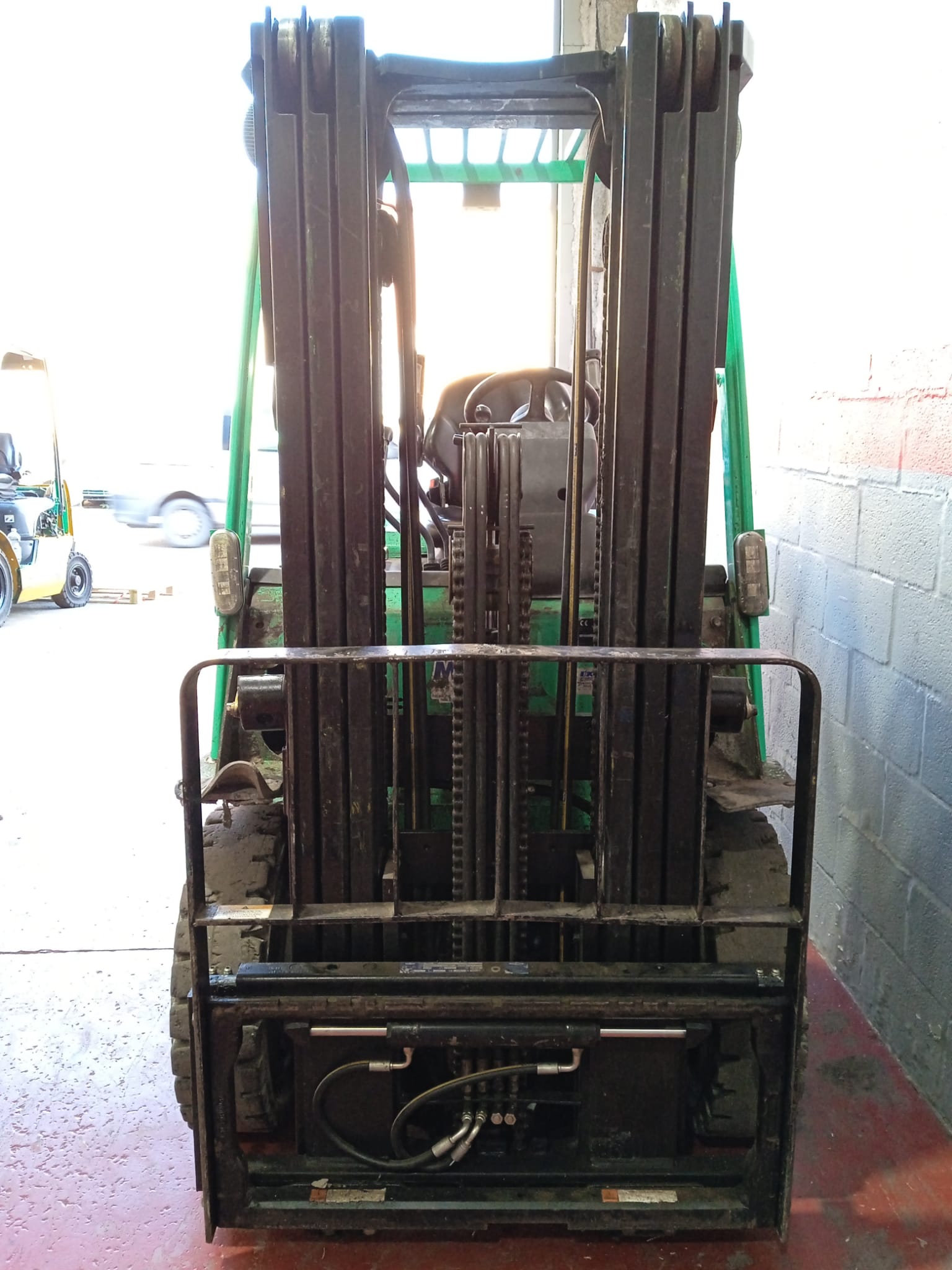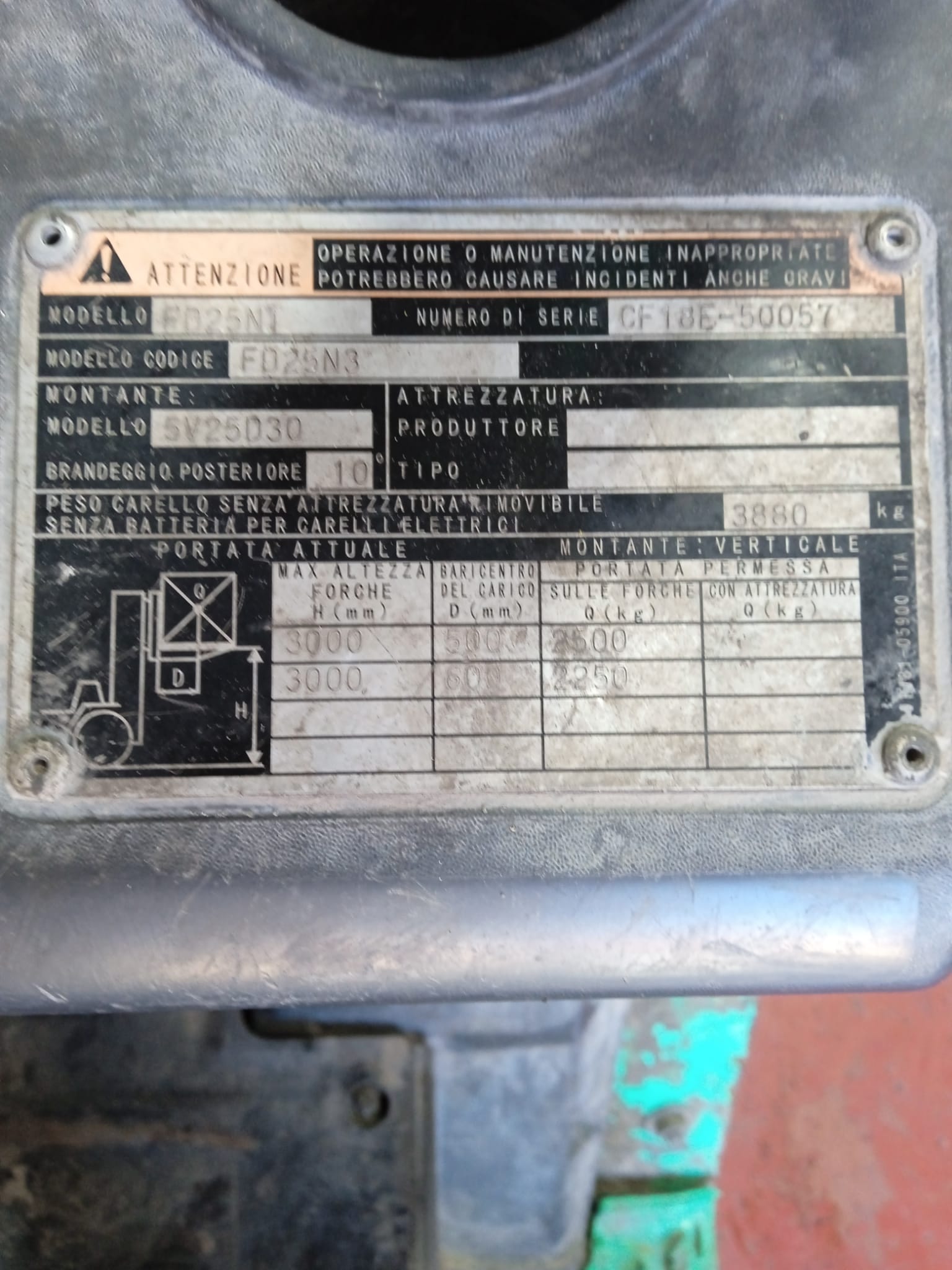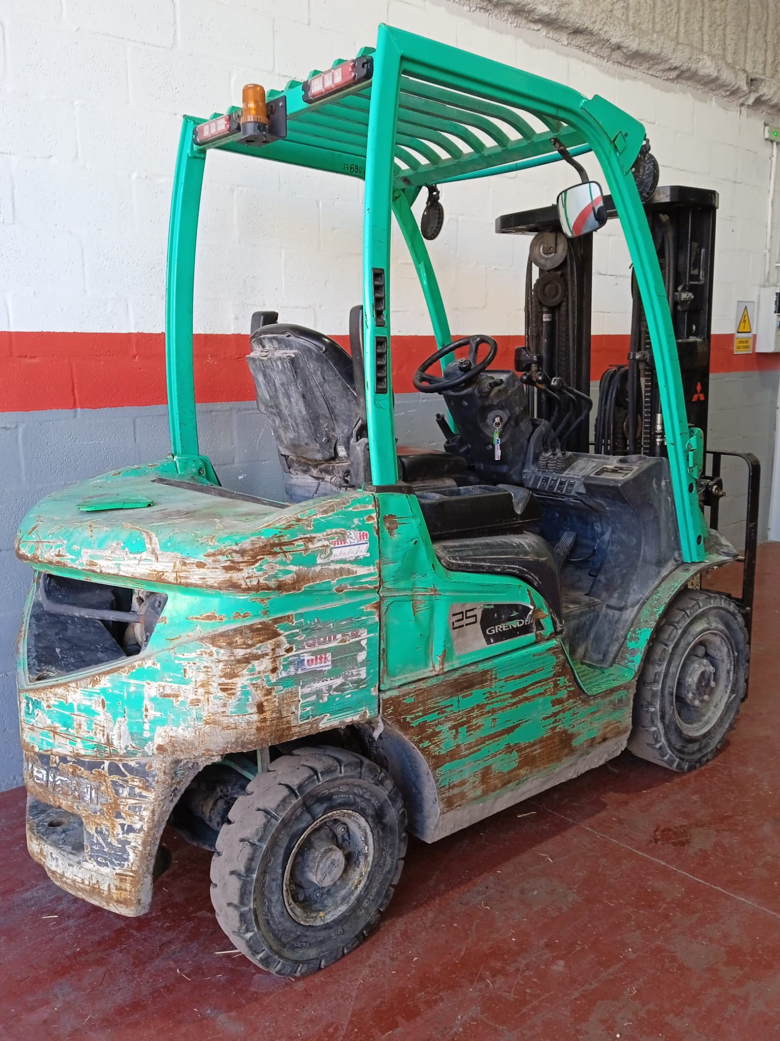 La Mitsubishi FD25NT es una carretilla elevadora diésel de cuatro ruedas, ideal para operaciones en almacenes y espacios reducidos. Con una capacidad de carga de 2.500 kg y un mástil tríplex que alcanza una altura de elevación de 4300mm, ofrece un rendimiento eficiente para tareas de manipulación de materiales.